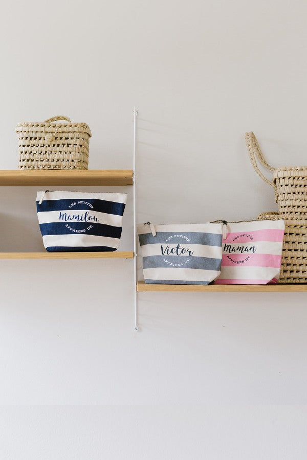 La trousse de toilette personnalisée avec prénom:Très pratique à glisser dans un sac ou une valise, la trousse de toilette personnalisée fait partie des indispensables de nos vacances et de nos weekends.